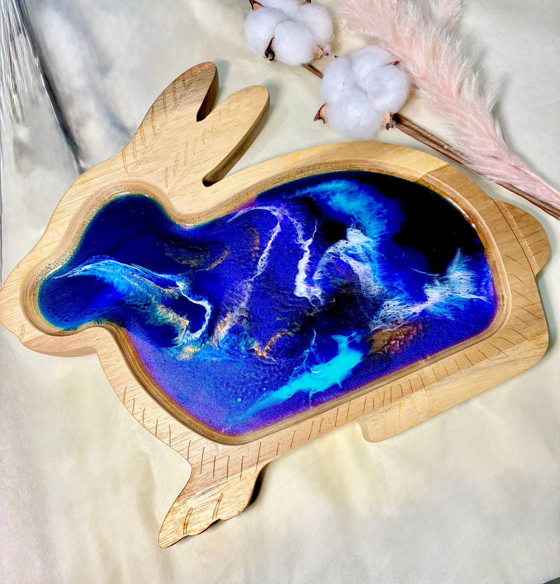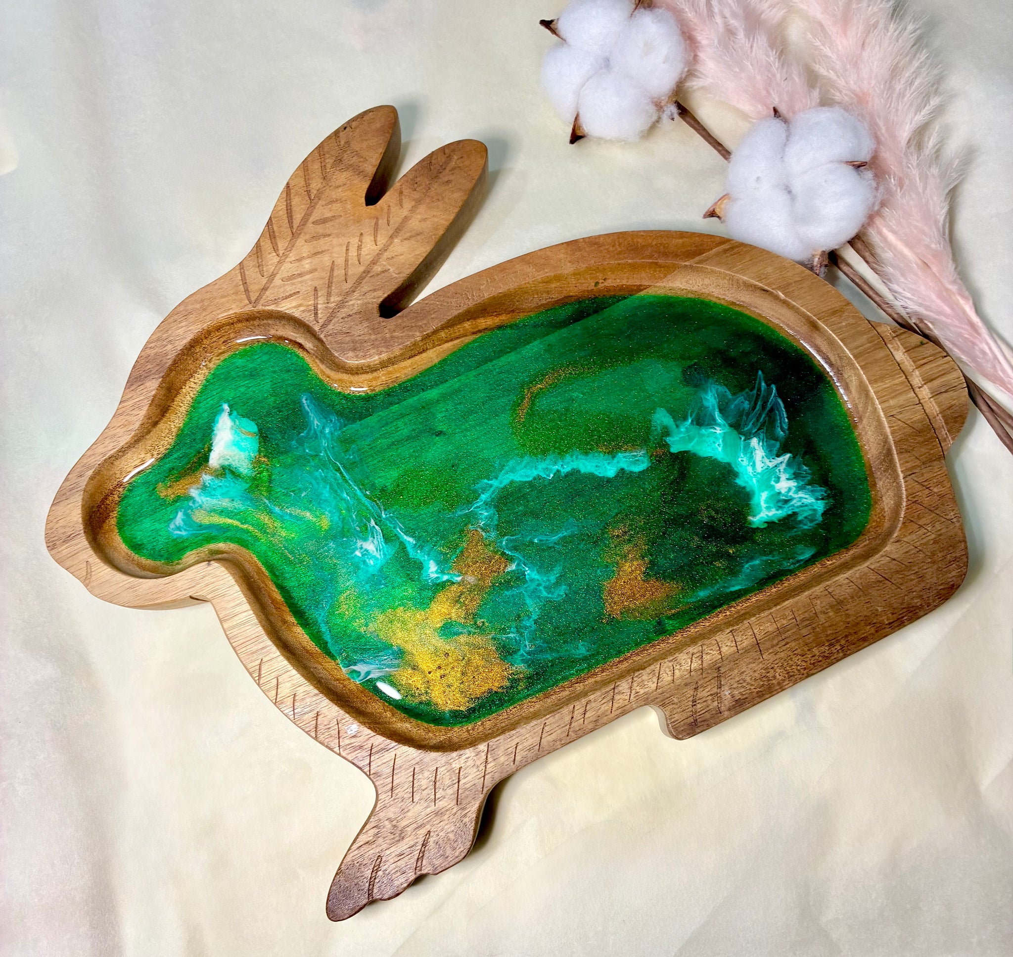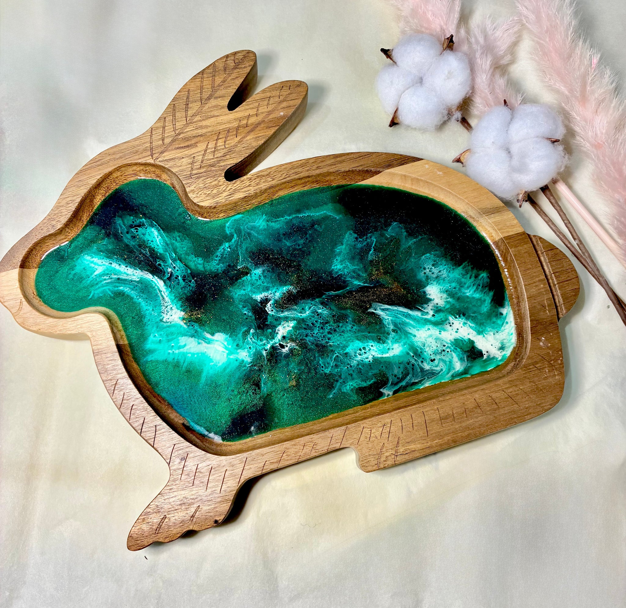 The Bunny Tray is crafted from high-quality resin, exhibiting slight imperfections that enhance its uniqueness rather than detract from its quality. Each tray is distinct, offering an individual aesthetic value while maintaining durability. Ideal for serving or decorative purposes, it combines functionality with a one-of-a-kind design.